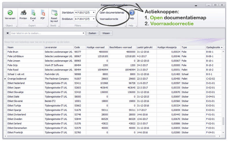 In het onderdeel Componentvoorraden kunnen alle voorraden en benodigde aantallen per component worden ingezien. Deze aantallen worden gebaseerd op mutaties vanuit onder andere de inkoop- en de verkooporders van componenten. Dit overzichtscherm bevat velen kolomkoppen die naar eigen wens kunnen worden toegevoegd, zie hiervoor het volgende (onderstaand) gedeelte van deze handleiding. In dit overzicht kan men een Voorraadcorrectie, Inkooporder, Inkooporder levering of Afval scherm aanroepen. Met deze functies kan de Huidige Voorraad aangepast worden. Ook is de Documentatiemap te openen middels een knop – deze knop volgt de verwijzing ingesteld bij het component in de Basis Gegevens.