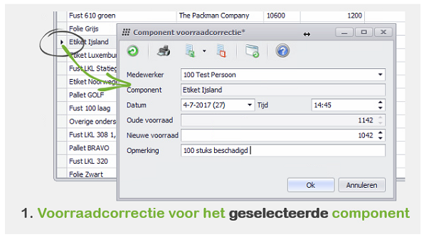 Voorraadcorrectie Voorraadcorrectie: Voer een correctie uit voor de voorraad van het geselecteerde component. Het ingevulde aantal wordt hierna gebruikt als het nieuwe leidende aantal. Tevens kan er bij de voorraadcorrectie een opmerking worden ingevuld, met bijvoorbeeld de reden dat er een correctie plaatsvindt. Na het invullen van de correctie kan met ‘Ok’ de correctie worden doorgevoerd. Voorraadcorrecties zijn in staat om de voorraad te verhogen of te verlagen. Hoewel het op de voorraad hetzelfde effect heeft als de inkooporders en afval knoppen, is de registratie achter de schermen anders. |