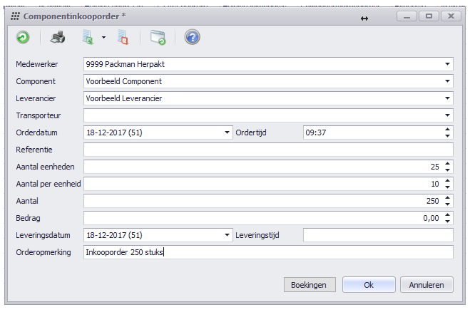 Inkooporder Met de knop Inkooporder kan er voor het geselecteerde component een inkooporder geplaatst worden. In deze eerste stap vult men de gegevens van het ingekochte component in. Dit is een besteld component dat hierna wordt getoond in het Componentinkooporder tabblad.Inkooporders kunnen vervolgens met de Inkooporder levering knop worden binnengeboekt. De controle van de ontvangen inkooporders vindt in een ander scherm plaats. Geleverde inkooporders komen als componenten bij de componentvoorraden erbij. |