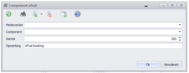 Afval Middels de afval knop kan er voor de geselecteerde componentregel afval worden ingevuld. Men vult het aantal en eventueel een opmerking in om de afvalboeking te doen. Indien wenselijk kan het component waarvoor de afval wordt geboekt, gewijzigd worden. Ingevoerd afval gaat van de huidige voorraad af. |