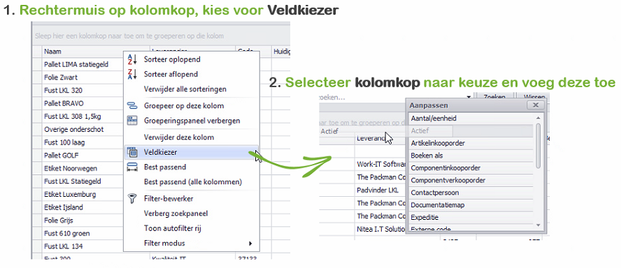 Kolomkoppen toevoegen Door vanuit de Veldkiezer items naar het grid te slepen, zijn deze toe te voegen. De veldkiezer kan worden geopend door met de rechtermuisknop op een kolomknop te klikken en te kiezen voor de Veldkiezer. Op deze manier kan dit grid naar eigen wens worden samengesteld. Dit overzicht heeft meer dan 25 opties voor de kolomkoppen, de data wordt enkel weergeven en kan (op de voorraad na) niet gecorrigeerd worden vanuit dit venster. Met de Reset lay-out knop kan het overzicht worden teruggezet naar de standaard instellingen. |