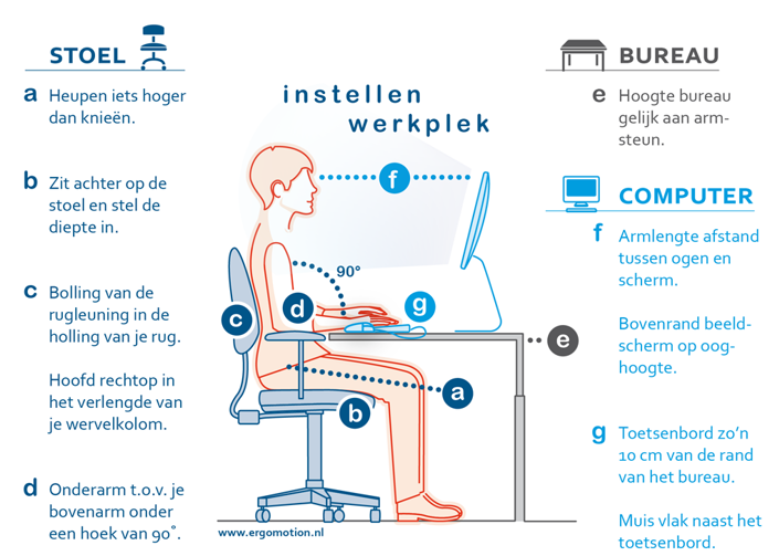 Bij vragen over het instellen van een ergonomische werkplek of beginnende klachten die veroorzaakt worden door de werkplek, kun je contact opnemen met de preventiemedewerkers.